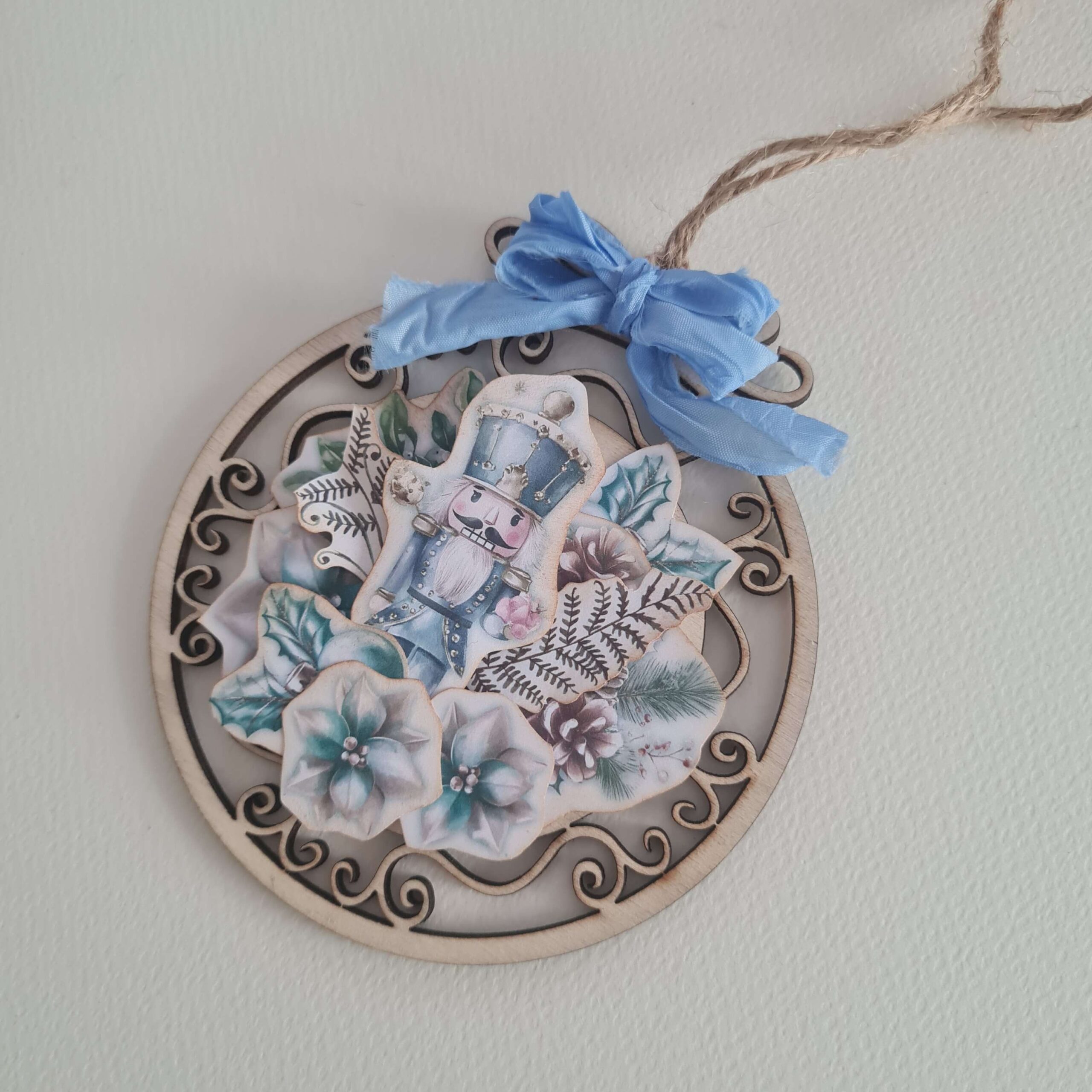 Коледна дървена играчка за елха, ръчно декорирана с дизайнерска хартия и декоративни елементи.