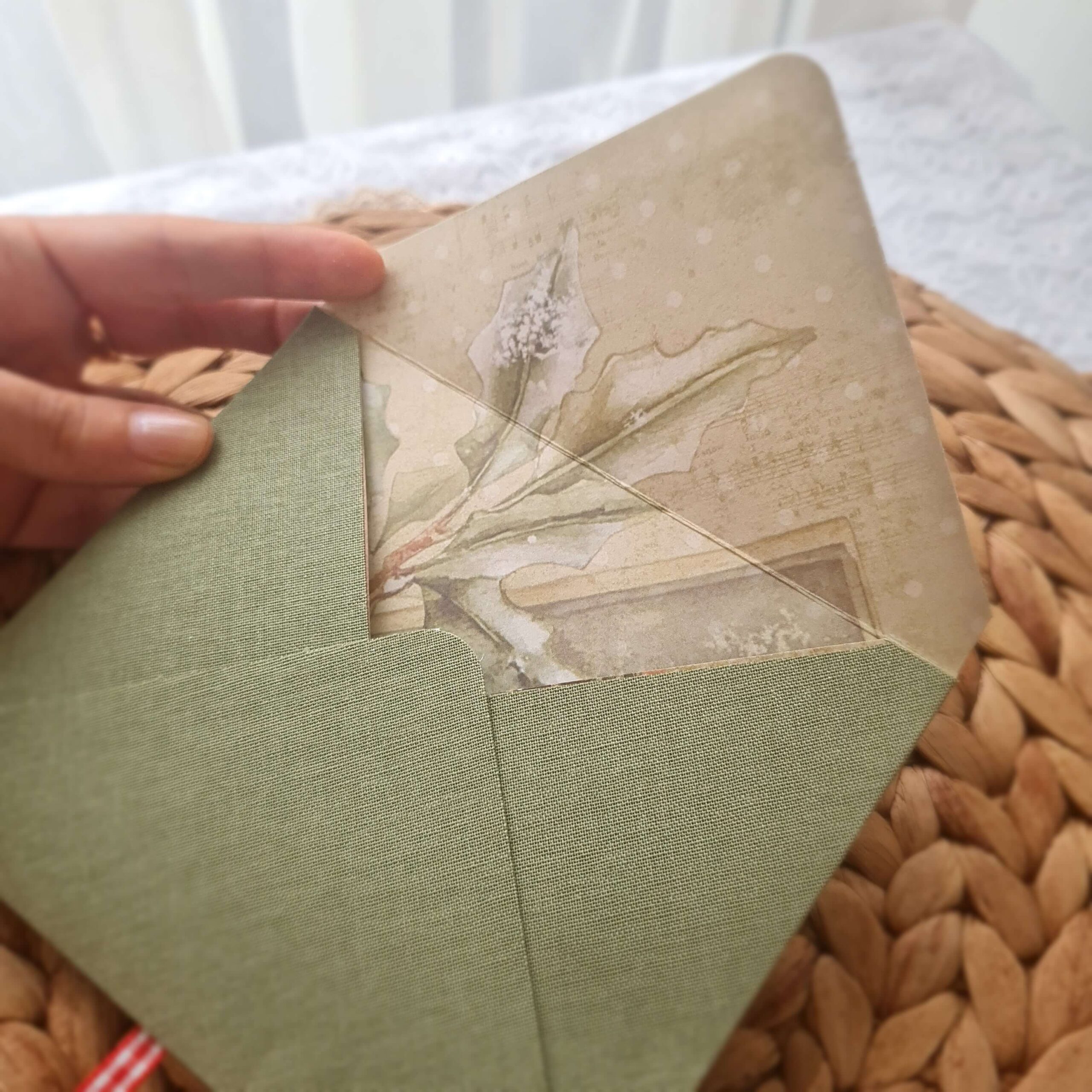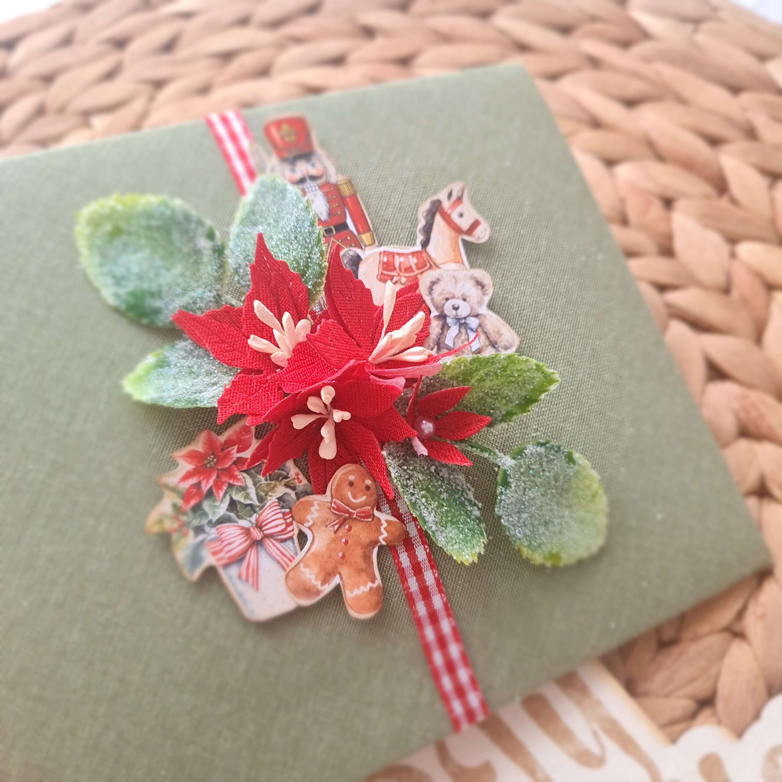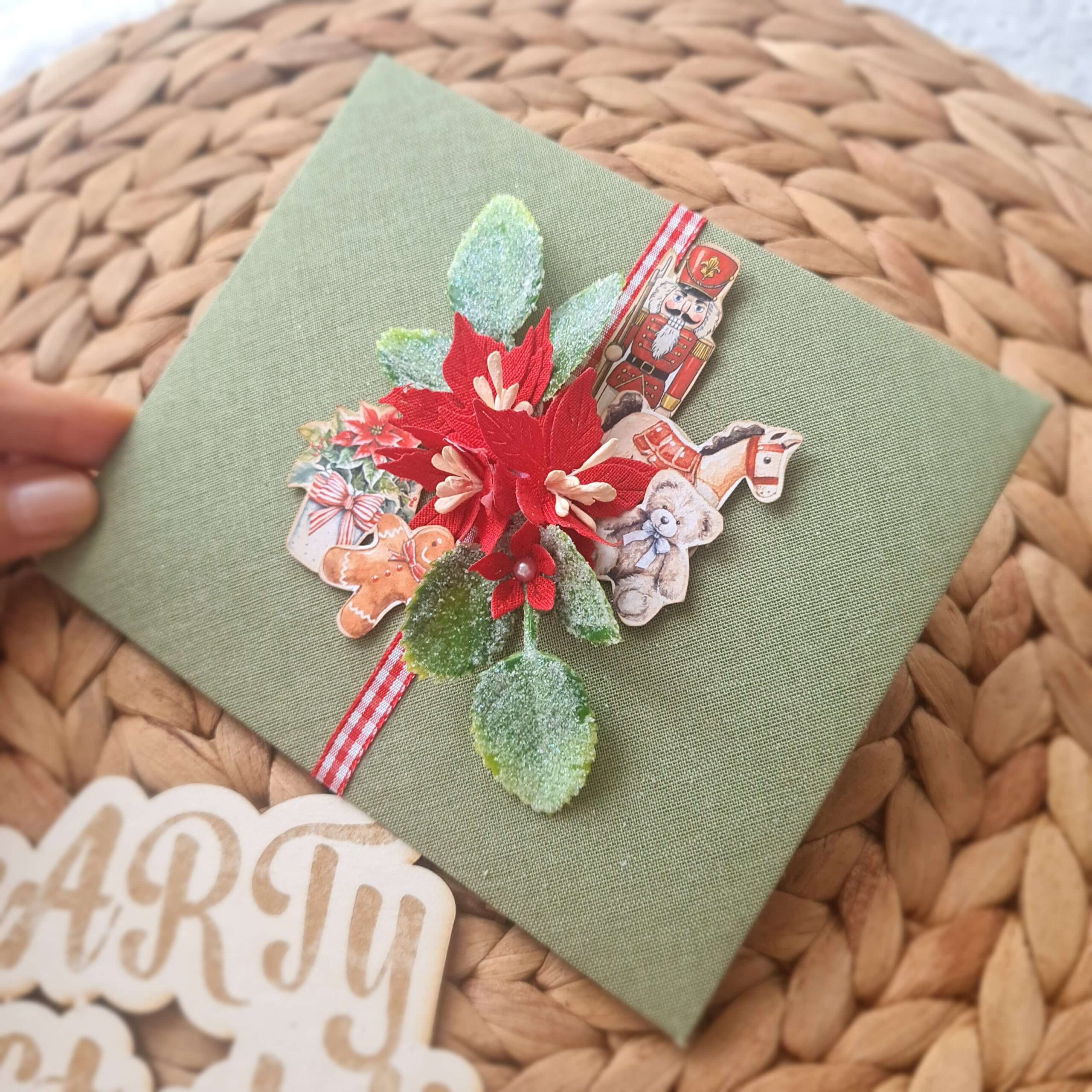 Ръчноизработен коледен плик, облечен в книговезко платно