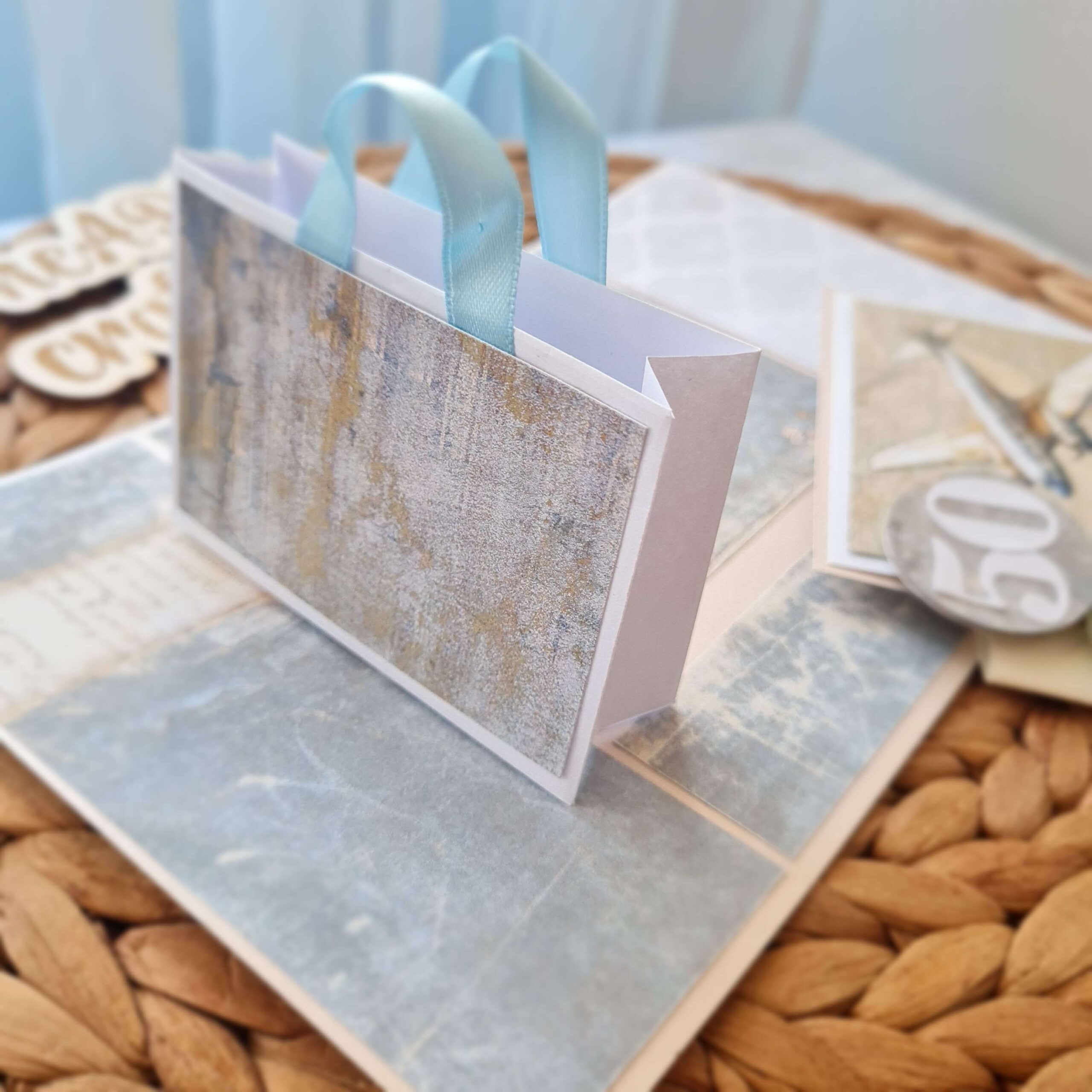с поп-ъп изскачаща чантичкаа , където да се постават пари, ваучер, с място за пожелание.