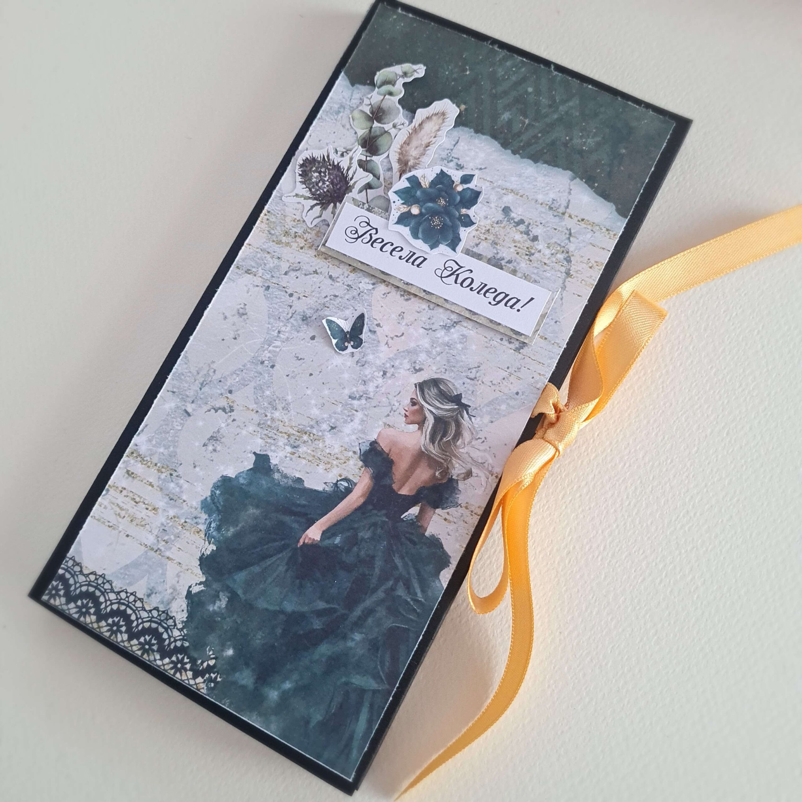 дизайнерска хартия 190гр., декоративни елементи и панделка.