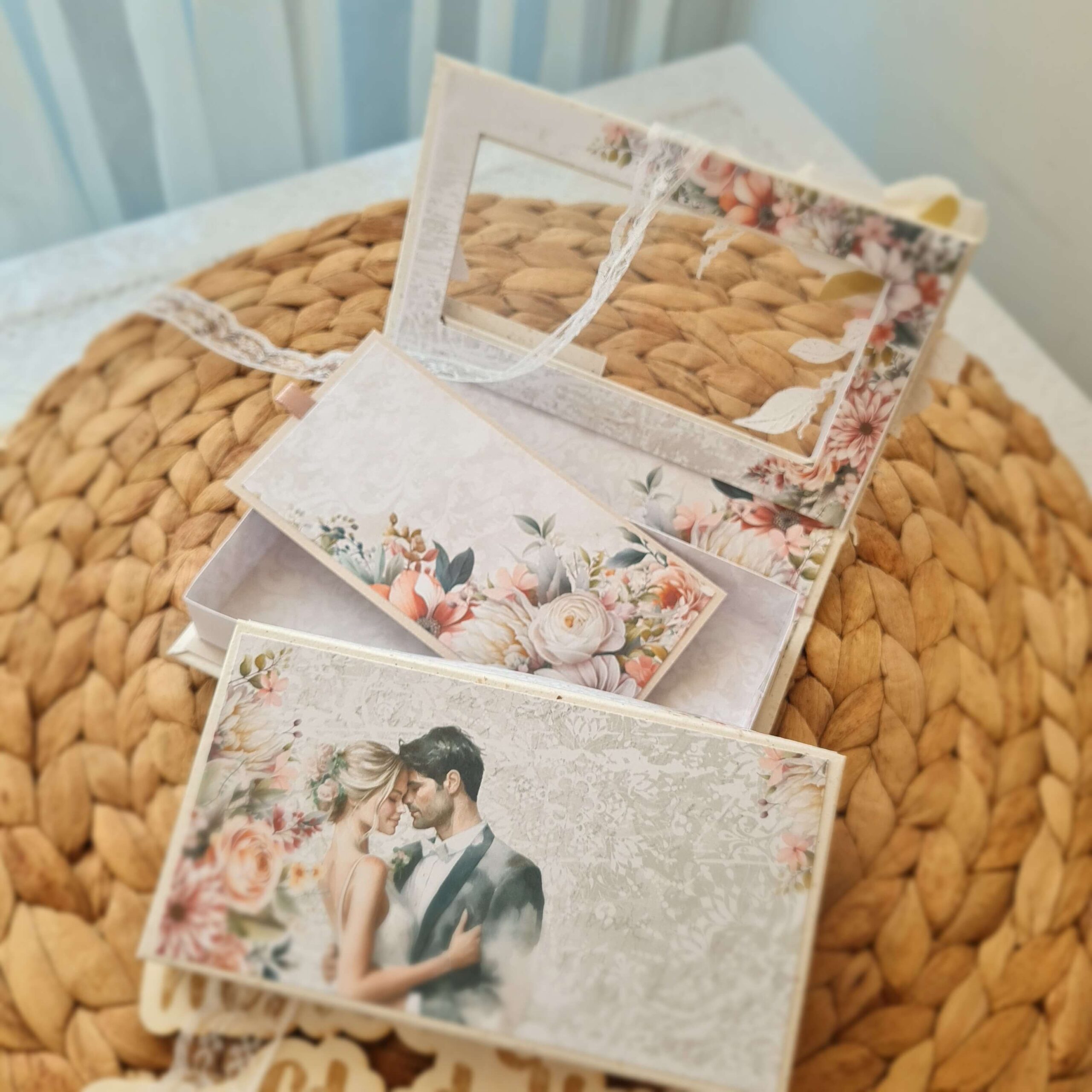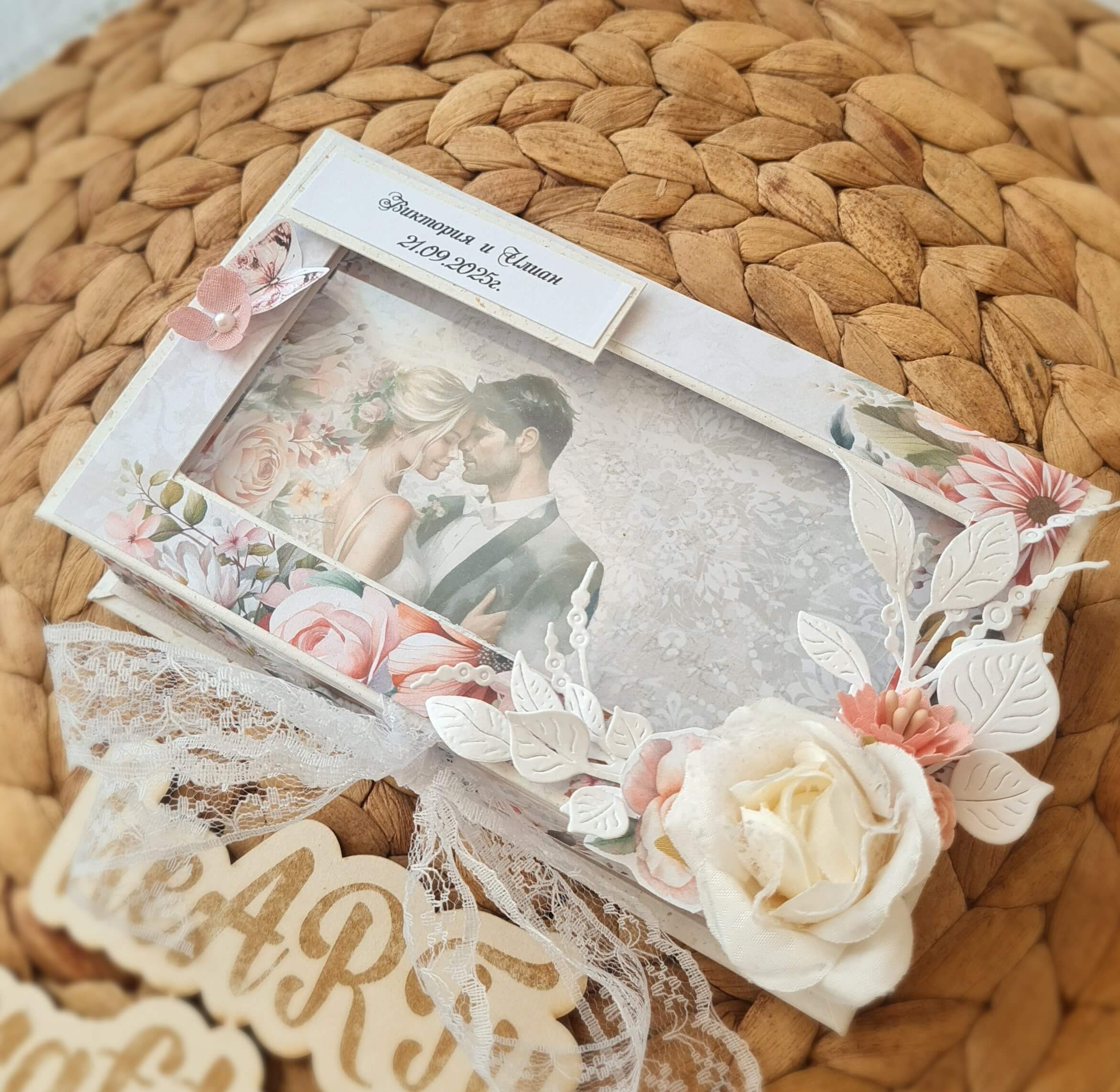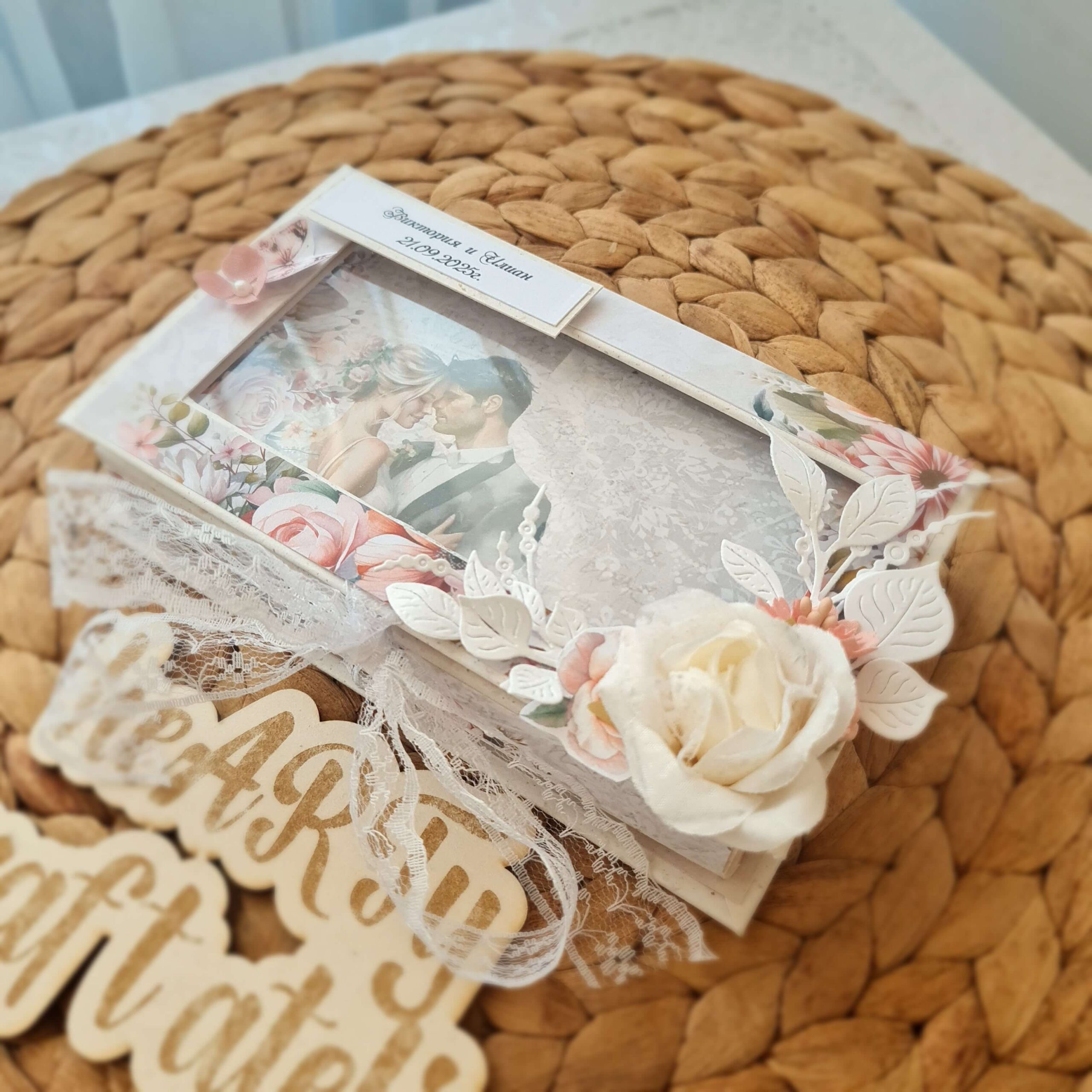 Сватбена картичка тип кутия , с размери 16см на 9см, с ацетатно прозорче.